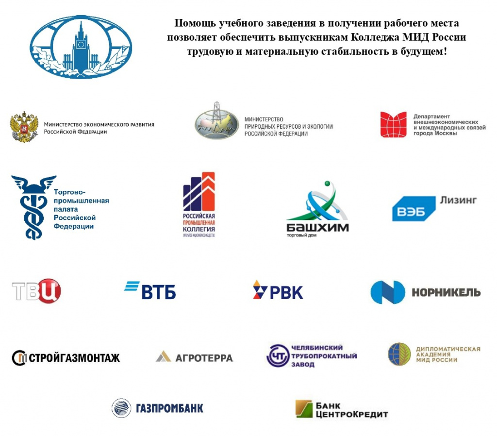 Колледж успешно оказал содействие в трудоустройстве выпускникам 2018 года, которое традиционно осуществлялось исходя из их оценки (рейтинга) индивидуальных достижений и в соответствии с Положением об организации и оказании содействия в трудоустройстве выпускников ФГБПОУ «Колледж МИД России» SIG (далее Положение). В процессе поиска работы некоторым выпускникам было предложено до 17 вакантных мест. Каждый выпускник имел, как минимум, 5 вакансий на выбор.